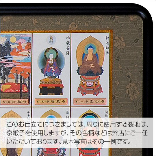 四国八十八ヶ所の『御影(みえい)』を欄間額へお仕立ていたします。一つ一つ熟練表具師により吟味された材料を使用して仕立て上げるお御影額。隅々に至るまでの 細かな細工に京表具師の技が光ります。 マット部は、真言宗はもとより、天台宗、禅宗、浄土宗等々あらゆる宗派のお客様に御利用いただける京緞子を使用しました。 渋い静かな仕立てでいつまでもご愛蔵いただけます。見本写真は使用裂地の一例で、柄は当方にご一任いただきます。 |
