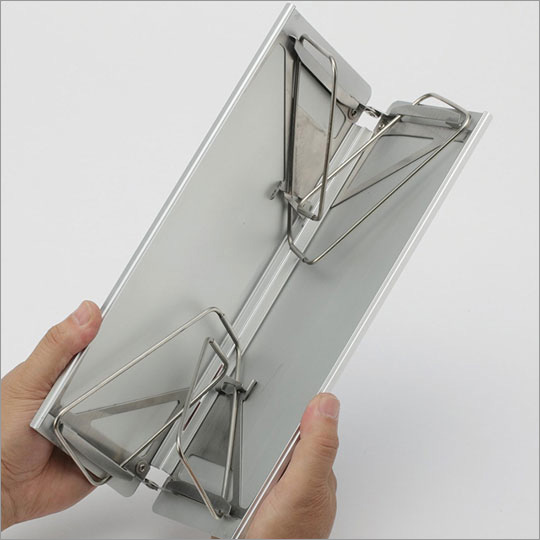 独自構造により、パッと開くだけのワンアクションで4本のスタンドが飛び出してテーブルのセットが完了します。収納も簡単に折りたたんで、専用収納ケースに入れて持ち運びにもかさ張りません。