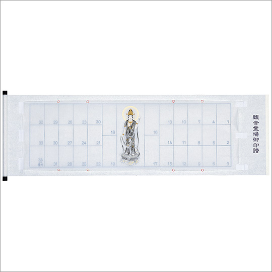 「西国・秩父・坂東兼用納経軸 額仕立て用」は、ご朱印欄は第1番から第33番までの33ヶ所のご朱印欄に加えて 34番又は番外として 1枠設けられています。合計34枠のご朱印欄がございます。 西国三十三ヶ所・坂東三十三ヶ所をお参りされる方は、番外として1ヶ寺だけご朱印をいただいてください。特に番外としての寺院指定は台紙にはされていません。 観音様は、絵絹に墨を基調として、若干の色使いで描画されています。とってもおとなしい絵柄で欄間額としてお部屋に末長く掲げていただけます。観音霊場の巡礼用としては珍しい一品です。 |
