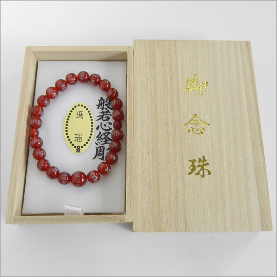 「ブレスレット 般若心経彫り メノウ(瑪瑙) 8mm玉 桐箱入り」は、直径10mmの親珠1個、直径8mmの主珠22個に合わせて直径6mmの天珠2個で32個珠で構成されたメノウ(瑪瑙)珠のブレスレットです。 2個の天珠以外の23個の一つ一つの珠には般若心経が掘り込まれています。中糸には丈夫で伸縮性があるシリコンゴムが使用されています。 | |