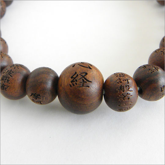 「ブレスレット 般若心経彫り 縞栴檀(しませんだん) 8mm玉」は、直径10mmの親珠1個、直径8mmの主珠22個に合わせて直径6mmの天珠2個で32個珠で構成された縞栴檀(しませんだん)珠のブレスレットです。 縞栴檀(しませんだん)は、美しい木目と落ち着いたライトブラウンの色合いが魅力で、白檀を彷彿させるほのかな芳香が特徴です。 2個の天珠以外の23個の一つ一つの珠には般若心経が掘り込まれています。中糸には丈夫で伸縮性があるシリコンゴムが使用されています。 | |
