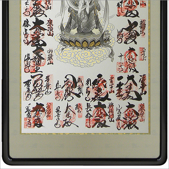 | 寸 法 | 西国三十三所等の通常巾納経軸・・・縦約155cm×横約58cm(額縁外寸) 四国八十八ヶ所等の広巾納経軸・・・縦約155cm×横約68cm(額縁外寸) |