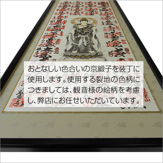 ■床の間だけでなく、洋間の壁面にもよく合う縦額仕立て 掛け軸お仕立て用の納経軸を縦額へお仕立ていたします。 昨今は、床の間を設けられていない洋風の住宅が増えており、納経軸を掛け軸でない縦額へのお仕立てのご要望にお応えしてお仕立てを追加いたしました。 掛け軸同様、一つ一つ熟練表具師により吟味された材料を使用して仕立て上げる縦額。隅々に至るまでの細かで丁寧に細工に本場京都の表具師の手技をご堪能ください。 縦額の黒縁は、額を下から受けて飾るものではないため、額の強度を考慮して横額に比べて太めの縁を使用しています。 マット部は、真言宗はもとより、天台宗、禅宗、浄土宗等々あらゆる宗派のお客様に御利用いただける上品な京緞子を使用しました。 落ち着いたお仕立てでいつまでもご愛蔵いただけます。 |